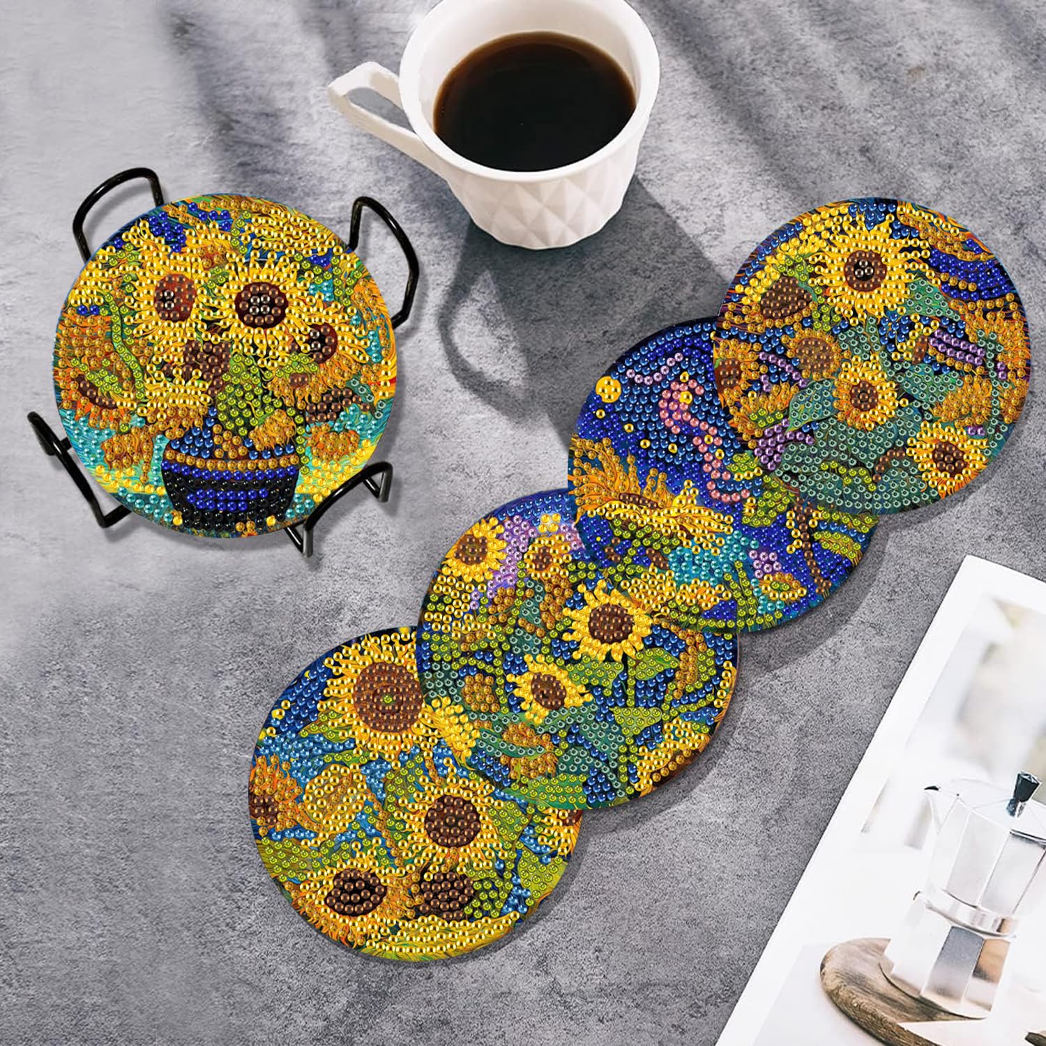 Sunflower Diamond Art Coasters Set of 6, Small Diamond Painting Kits for Adults Beginners, Cork Coaster for Drinks Gem Art Coasters with Holder Home Decor