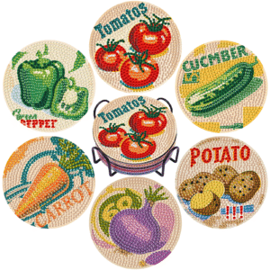 6Pack Diamond Painting Coaster with Holder 5D Diamond Art Kits for Adults Round Full Drill Beginners Gem Dots Craft Arts Supplies Party Home Decor Vegetable