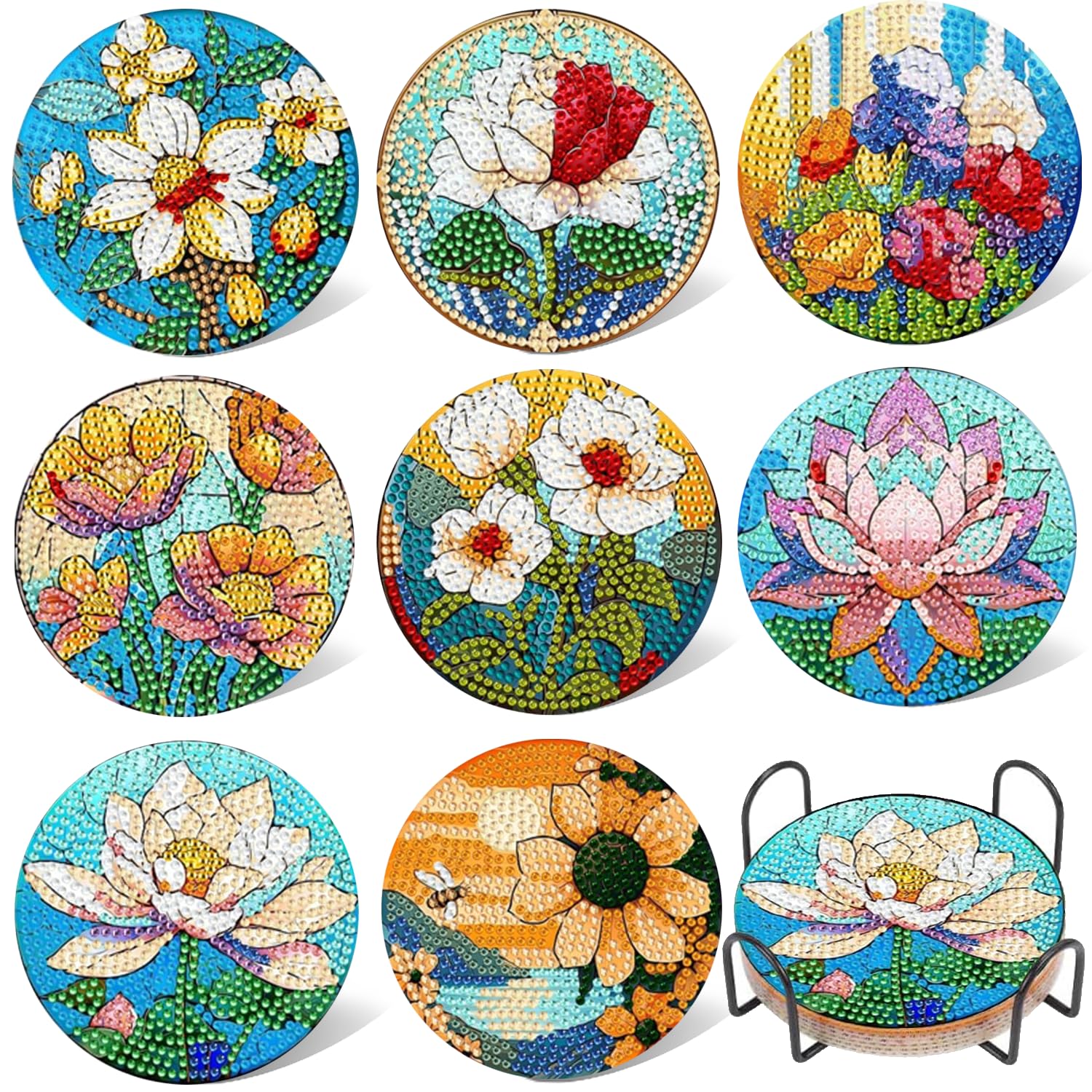 8 PCS Small Diamond Art Coasters Kits, Diamond Painting Coasters, Fall Diamond Art Kits for Adults Beginners, Arts and Crafts Item Sets with Holder for Drinks Flower Style