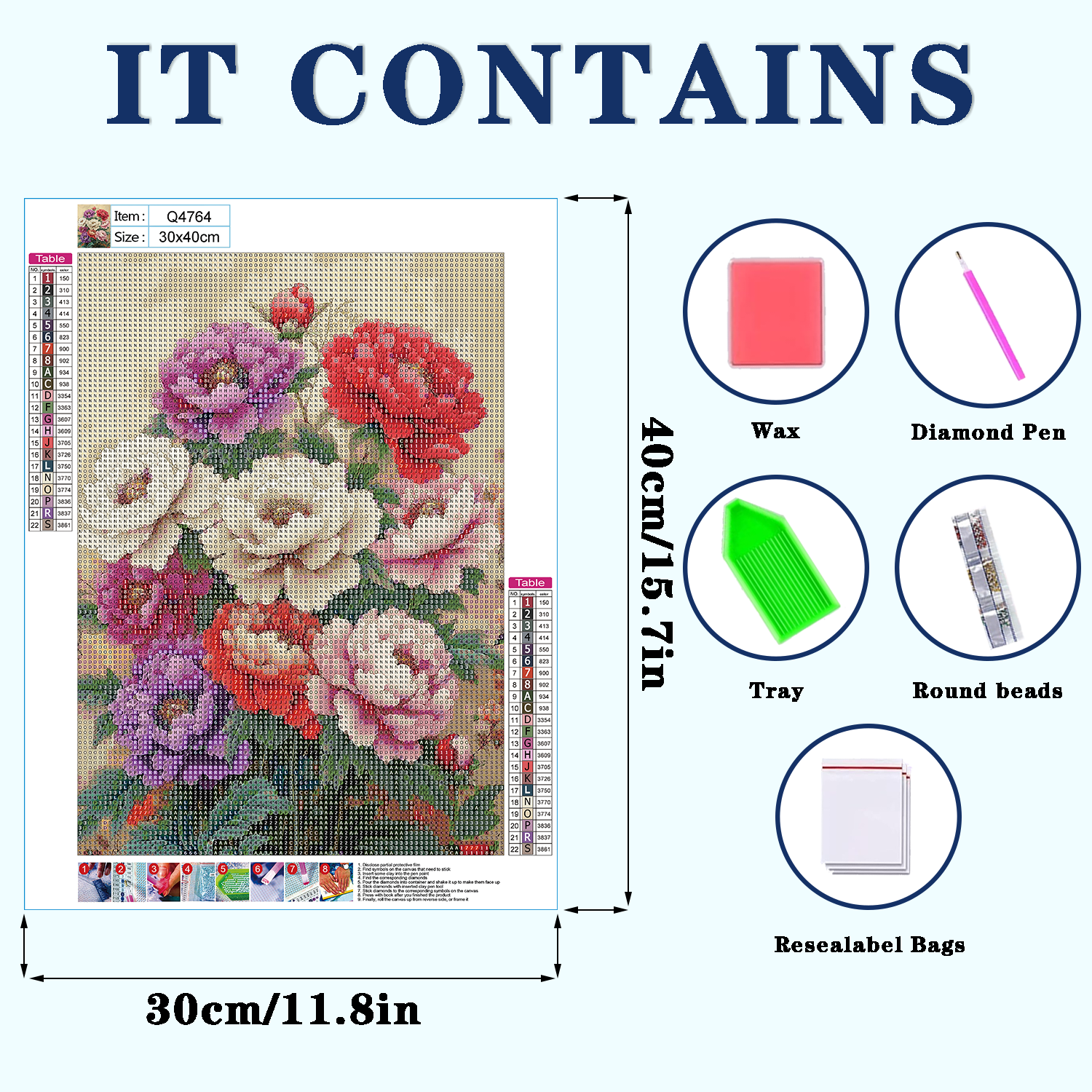 • Genuine DIAMOND DOTZSO® – permata resin khas kami yang berpotongan cemerlang, disortir berdasarkan warna agar proses pengerjaan lebih halus dan cepat.