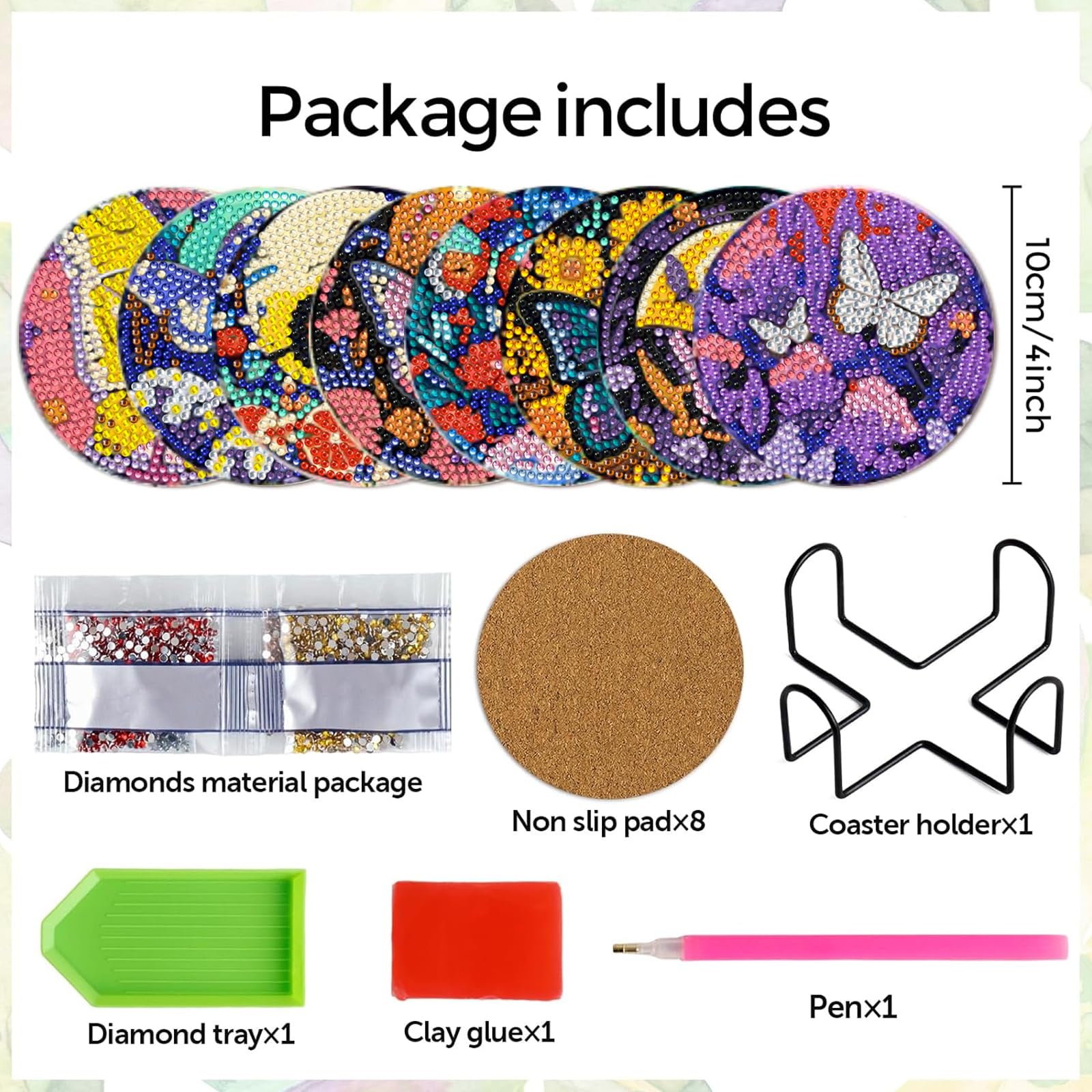 8 Pieces Butterfly Diamond Painting Coasters with Holder – Diamond Art Coasters with Cork Base for Beginners Adults & Craft Supplies Party Gift