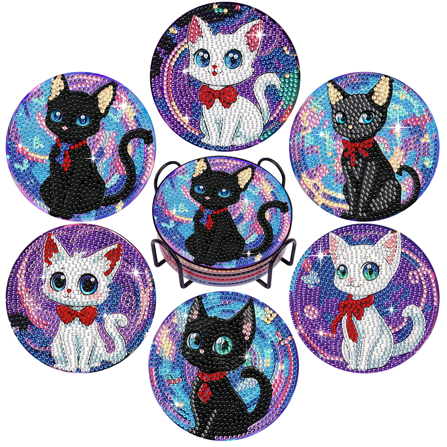 Cat Diamond Art Coasters Set of 6, Small Diamond Painting Kits for Adults Beginners Women, Gem Art Coasters with Holder, Funny Arts Supplies for Kitchen Decor Cat
