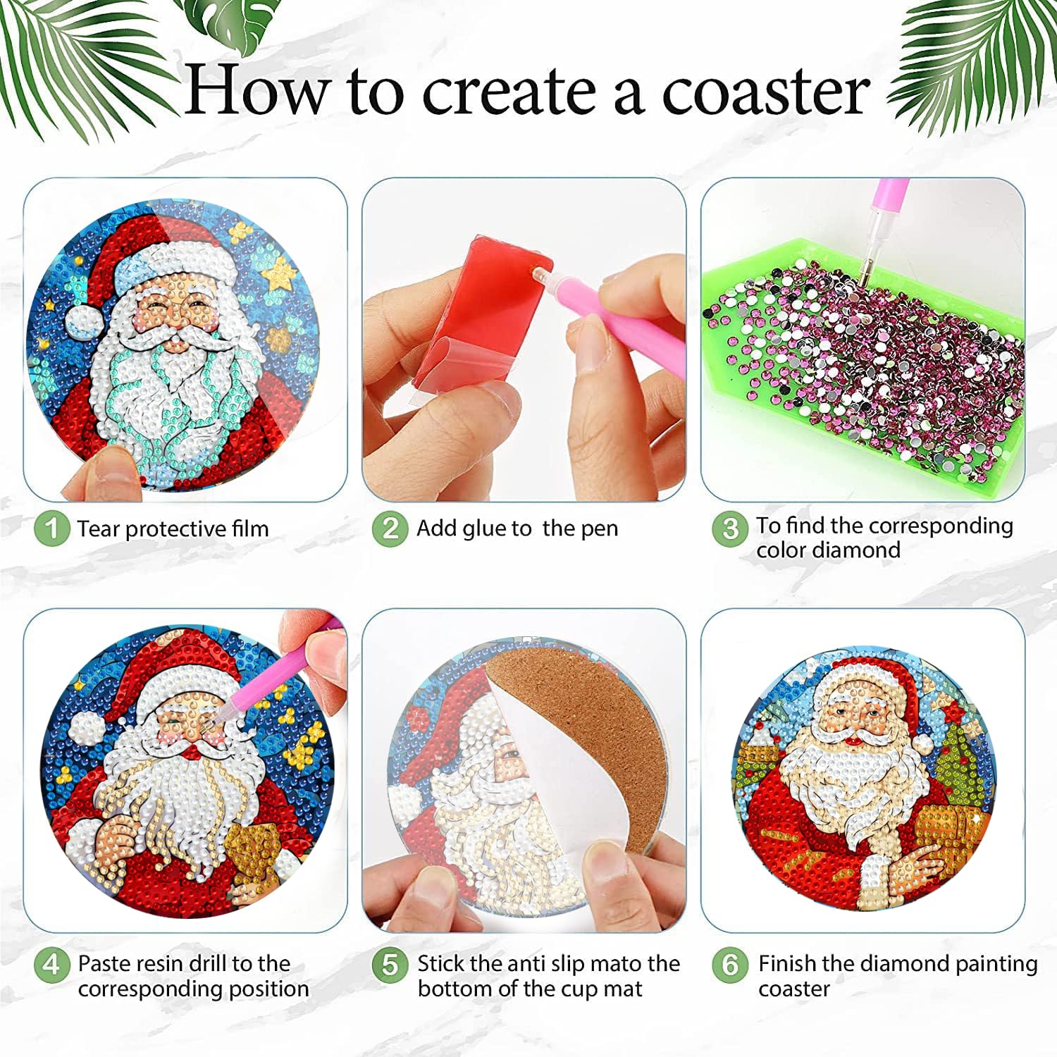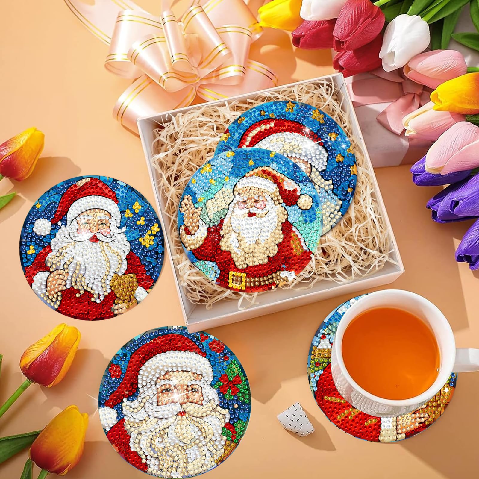 6 Pcs Diamond Art Kits for Adults – Diamond Art Coasters with Holder for Adults Beginners Diamond Craft for Christmas Birthday Gifts (Santa Claus)