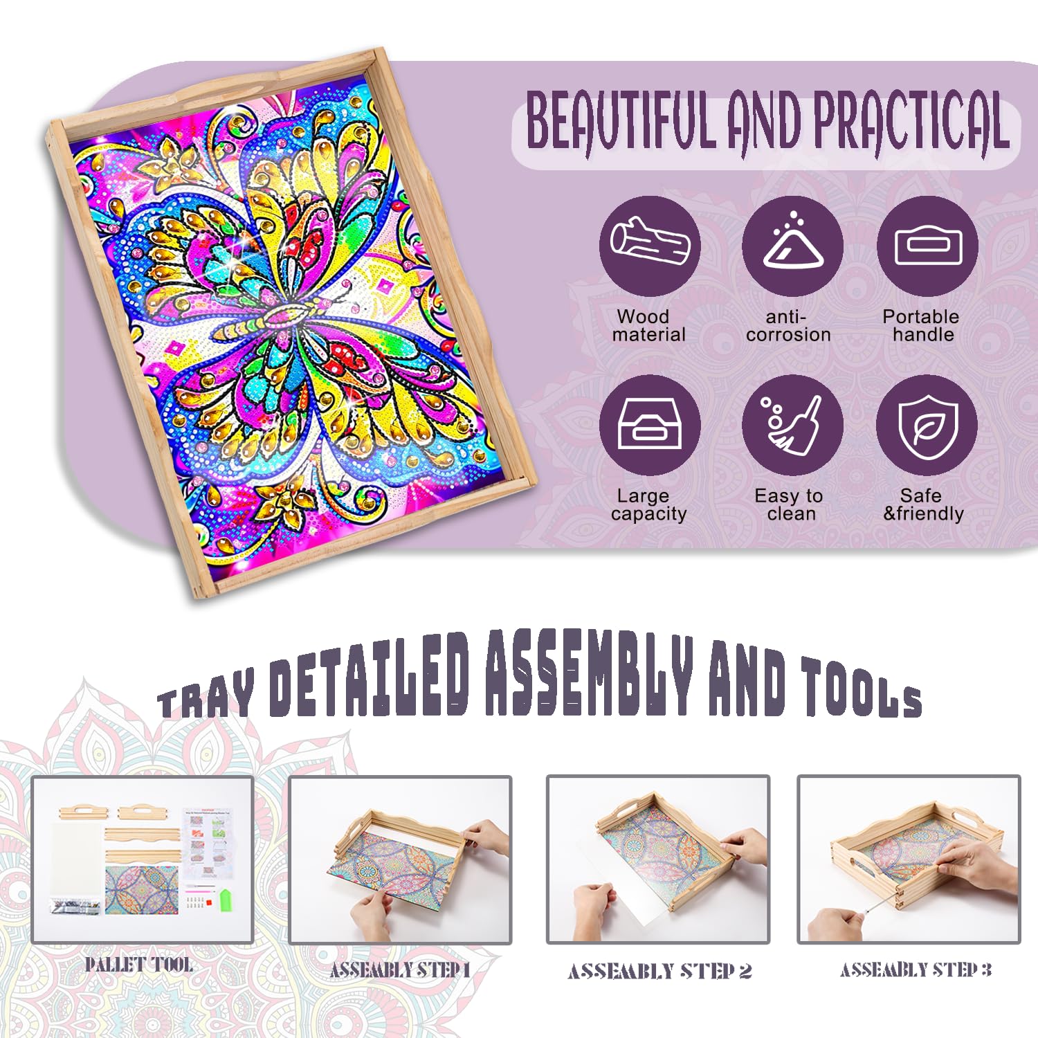 Diamond Art Kits for Adults Wooden Serving Trays with Handles, 5D Diamond Painting Big Gem Arts and Craft Gifts Trays Decor Gift Home Decor 12.2×16.1 Inches Butterfly B
