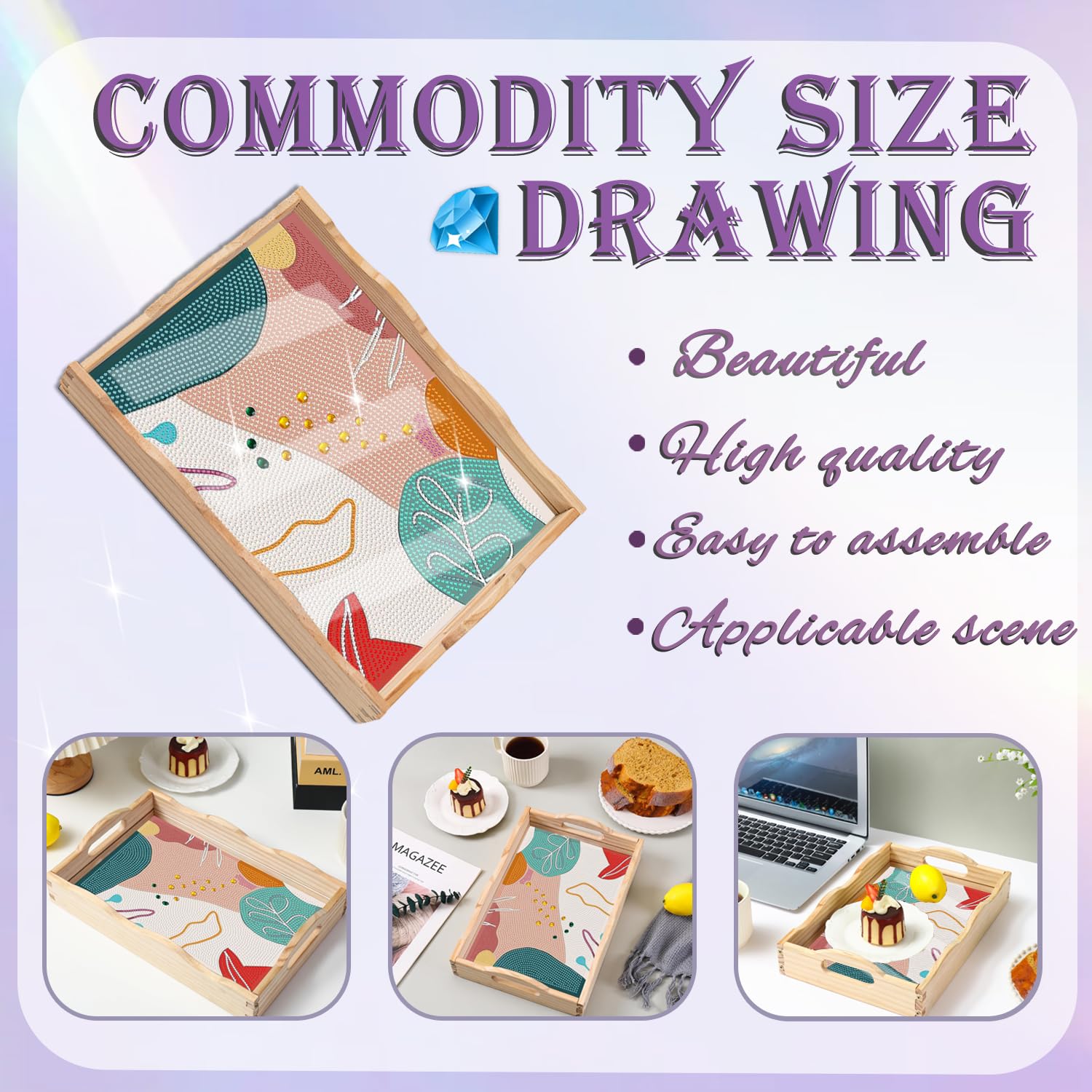 Diamond Art Kits for Adults Wooden Serving Trays with Handles, 5D Diamond Painting Big Gem Arts and Craft Gifts Trays Decor Gift Home Decor 9.8×13.8 Inches Abstract B