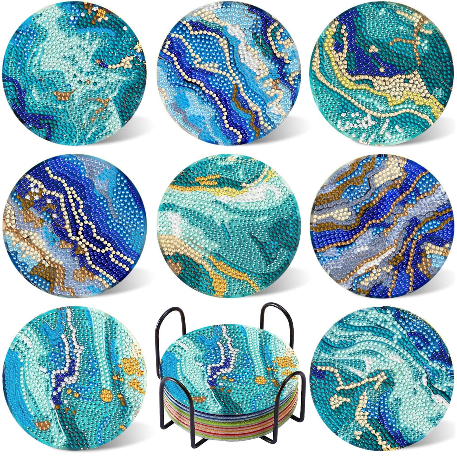8PCS Diamond Art Coasters Small Diamond Painting Kits for Adults Beginners Women Gem Art Coasters with Holder Funny DIY Crafts for Home Decor Blue Ocean