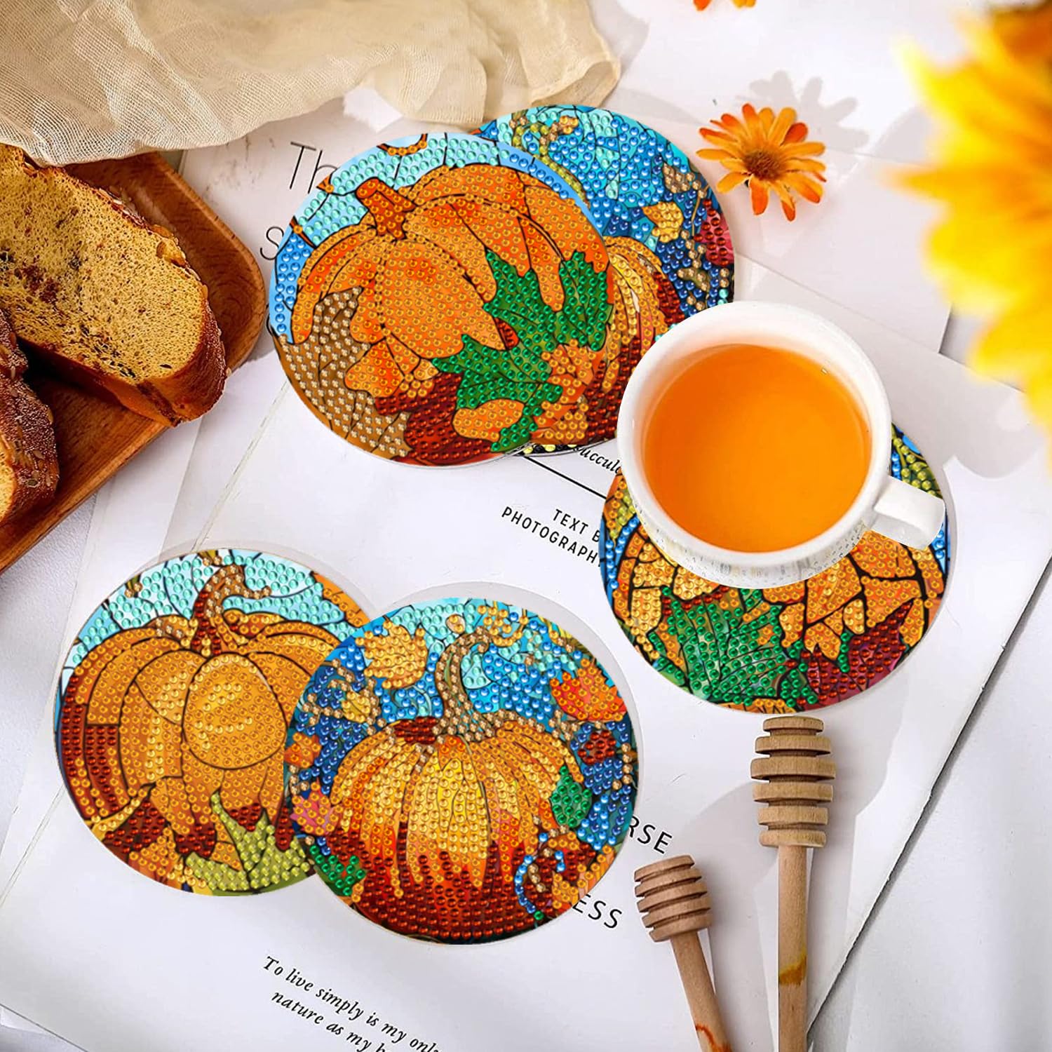 8 Pcs Pumpkin Diamond Art Coasters with Holder Diamond Painting Coasters for Beginners Adults Beginners for Birthday Gifts Craft Supplies