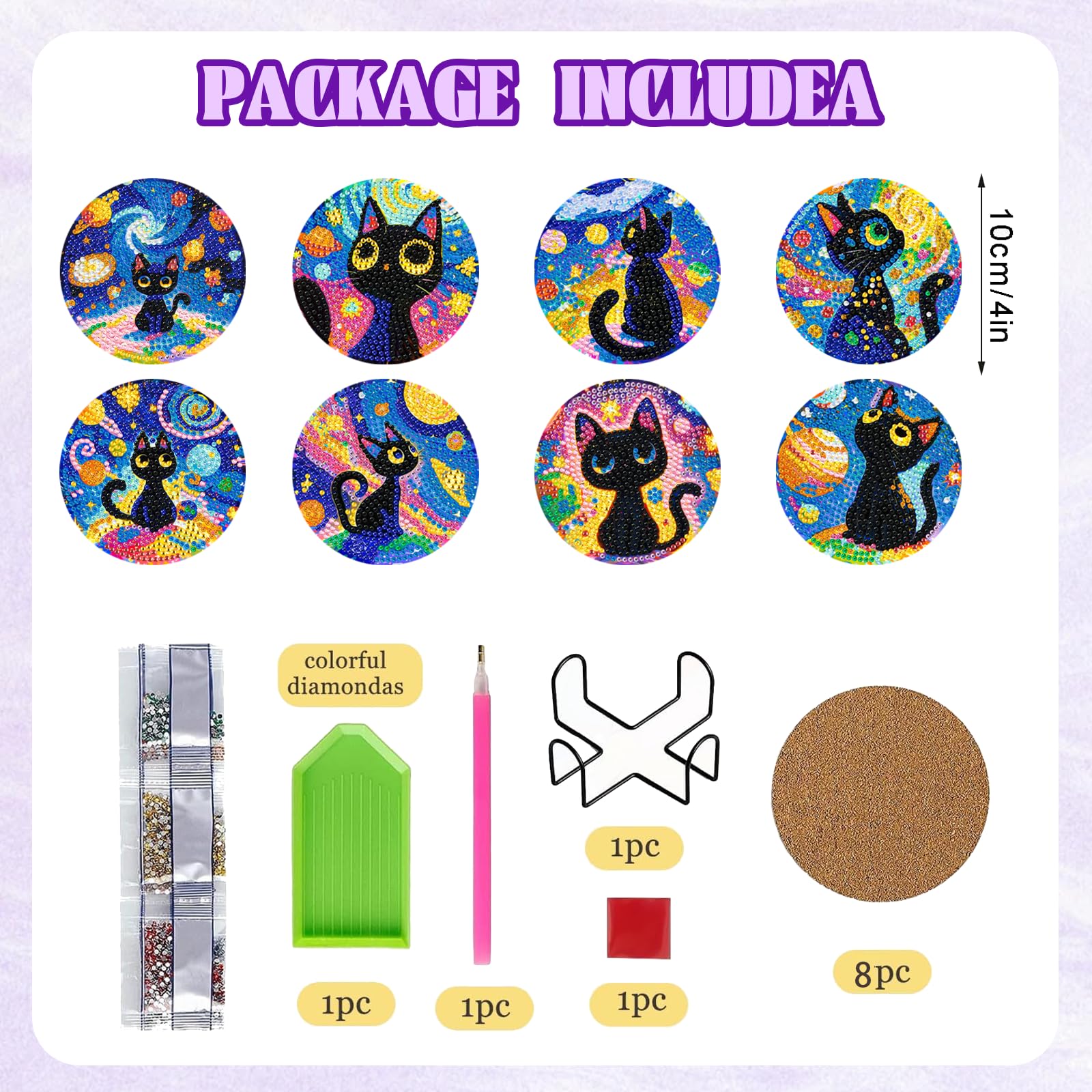 8 PCS Diamond Art Coasters Kit, Cat Diamond Painting Coasters with Holder, Fall Diamond Art Kits for Adults Beginners, Arts and Crafts Supplies Black Astral Cat Animals