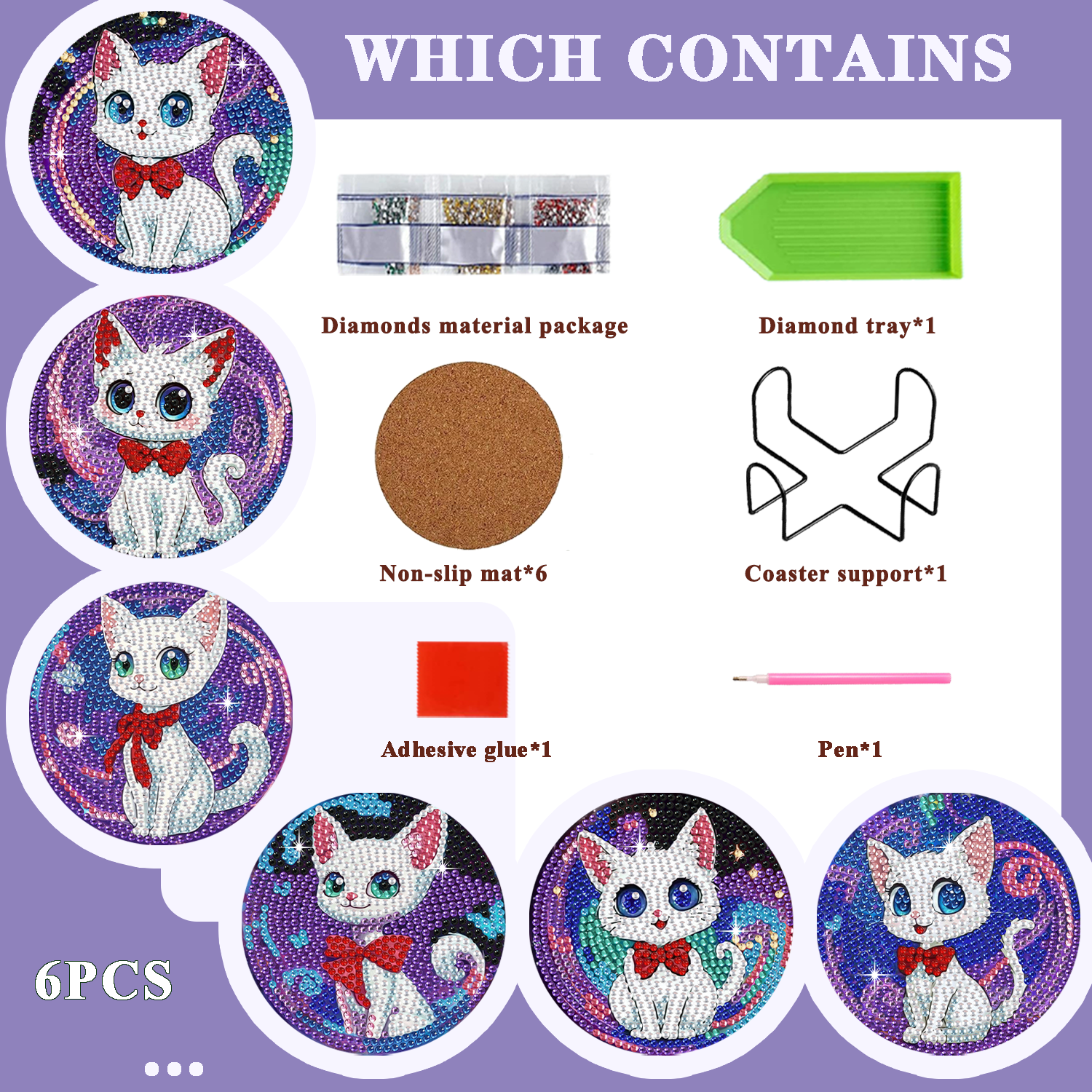6PCS Cat Diamond Art Coasters Small Diamond Painting Kits for Adults Diamond Dots Round Full Drill Diamond Coasters with Holder Easy Art Crafts for Beginners Women
